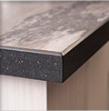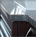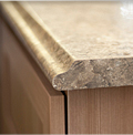 Comptoir fabriqué de stratifié fait sur mesure avec une bordure de surface solide, il offre les mêmes avantages que le comptoir carré en plus d'offrir un look plus raffiné, un nez plus résistant et permet l'installation d'un évier sous plan (undermount).